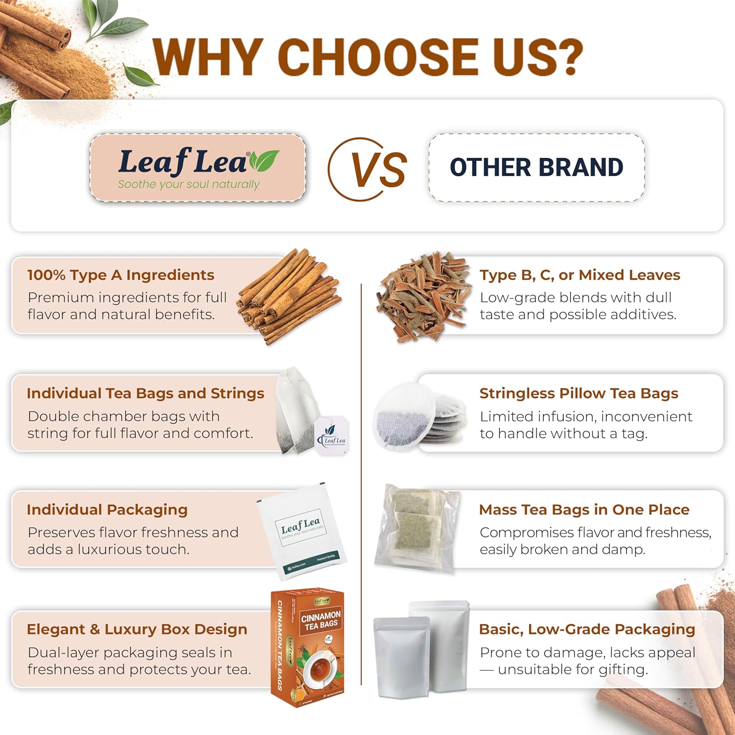 - Bold, Sweet, and Spicy Cinnamon Flavor: Enjoy the naturally sweet and spicy taste of LeafLea Cinnamon Tea. With a robust, warming flavor, it's perfect for starting your morning or unwinding in the evening for a refreshing experience