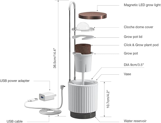 - Full-Spectrum LED Grow Light: Designed to promote plant health, the grow light features an automatic timer, running for 16 hours on and 8 hours off. Easily adjust the lamp's height as your plants grow, thanks to a magnetic connection between the arms and the lamp. Keep it approximately 5 cm above your plants for the best results