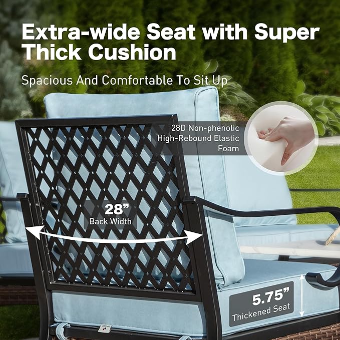- 【LUXURIOUS 5.75" EXTRA THICKER CUSHION】This patio furniture set comes with a 5.75-inch extra thick soft cushion filled with 28D density phenol-free sponge with high resilience for comfortable sitting. Enjoy a comfortable ride even if you use it for a long time, and say goodbye to the worries of collapsing seat cushions