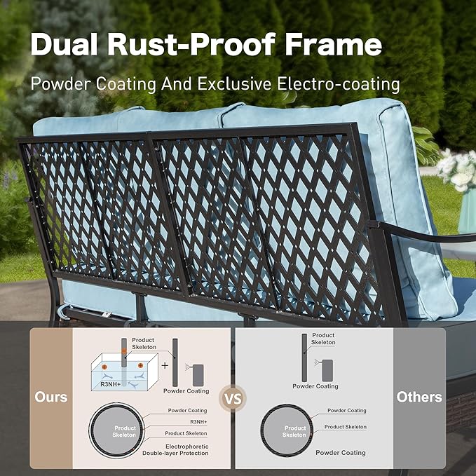 - 【ALL WEATHER HEAVY-DUTY FRAME】This metal backyard furniture set is made of high-performance E-COATING and POWDER-COATING dual rust prevention techniques that are All weather resistant, anti-rust, and easy to clean, with no special care needed. That patio conversation set has a heavy-duty wrought iron metal frame, The single chairs could support up to 350 lbs weight, the 2-seater sofa supports 700 lbs and the 3-seater sofa supports 900 lbs