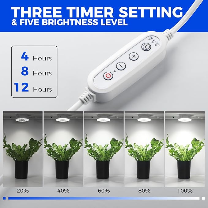 - 3 Timer Setting & 5 Brightness Levels: The Barrina grow light for indoor plants offer 3 convenient settings (4H/8H/12H) and 5 dimming levels. This functionality allows you to create the perfect lighting schedule and promote good development and maximizing yield
