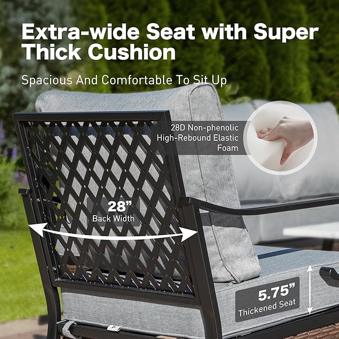 - 【LUXURIOUS 5.75" EXTRA THICKER CUSHION】This patio furniture set comes with a 5.75-inch extra thick soft cushion filled with 28D density phenol-free sponge with high resilience for comfortable sitting. Enjoy a comfortable ride even if you use it for a long time, and say goodbye to the worries of collapsing seat cushions