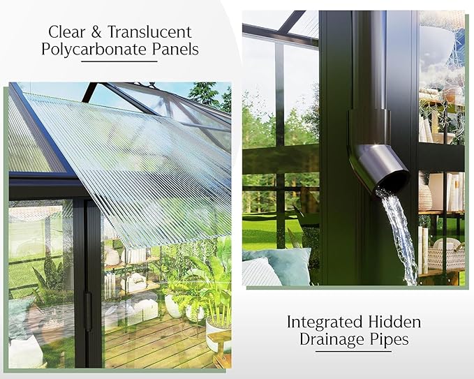 - 【Ventilated and Drainable】Provides continuously fresh air to your plants with 2 ventilation windows. The backyard greenhouse features a purpose-built drainage system for efficient rainwater drainage and collection.