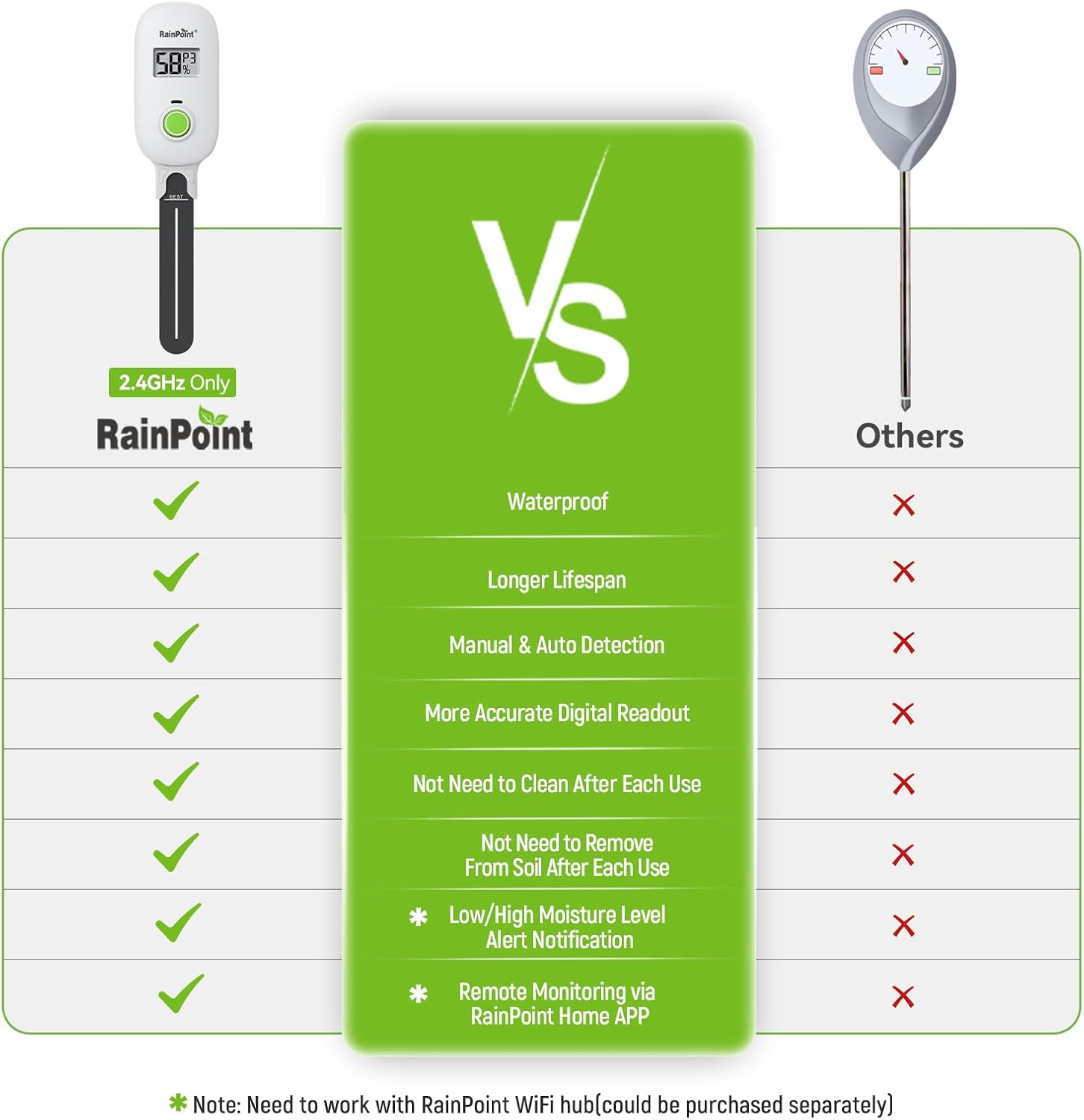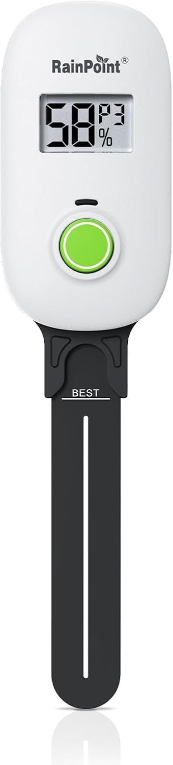 - 【🚀Capacitive Probe】Unlike traditional resistive probes which are prone to rust causing resuced accuracy, our RAINPOINT high-precision soil senor maps moisture with a long-lifespan capacitive probe. Easily know your pothos is thirsty before it droops, or your peppers need a drink without digging.