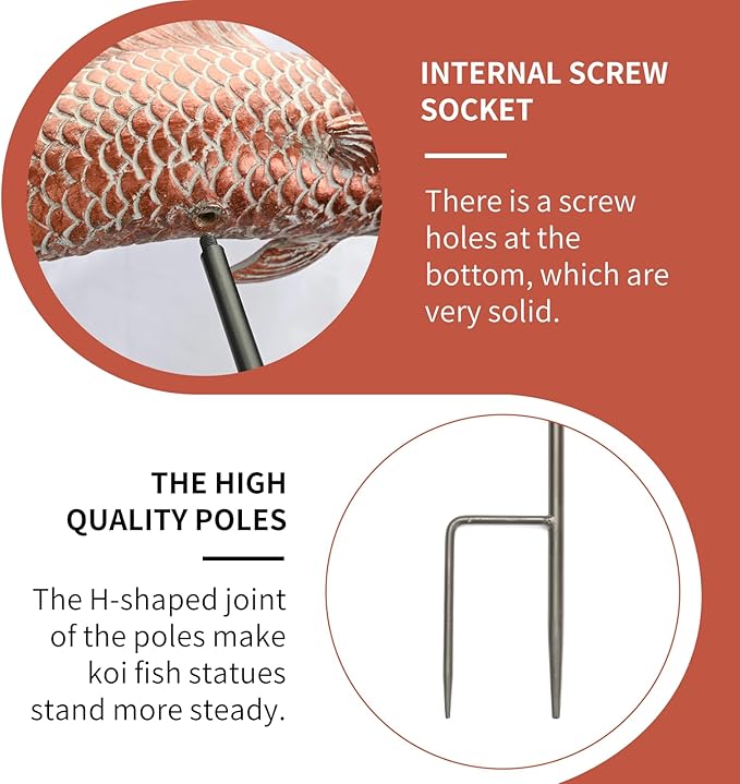 - Easy to Install: This fish garden decor statues does not require any tools, and can be placed anywhere you want by inserting an iron rod into the hole under the fish maw. Please dont push from the top of the fish itself.
