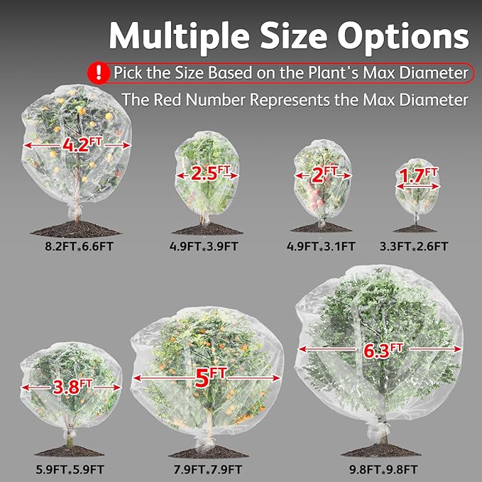 - JOJOLEE Garden Net Kit: This kit includes 4 packs of 4.9 ft(H) x 3.9 ft(W) garden net with a spread diameter of 2.5 ft. Before buying, please take the time to check the diameter and height of your plant to make sure the insect netting is sufficient to cover it.