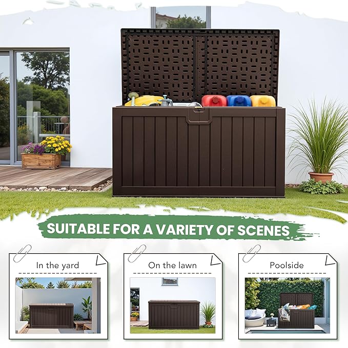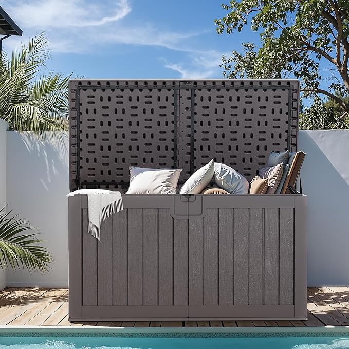 - Waterproof and Stylish Design: Constructed from high-quality resin, Greesum Outdoor Storage Box is waterproof and UV-resistant, making it ideal for outdoor use. Its simple vertical grain design adds a natural charm, perfect for your yard, garden, or by the pool, enhancing both functionality and aesthetics.
