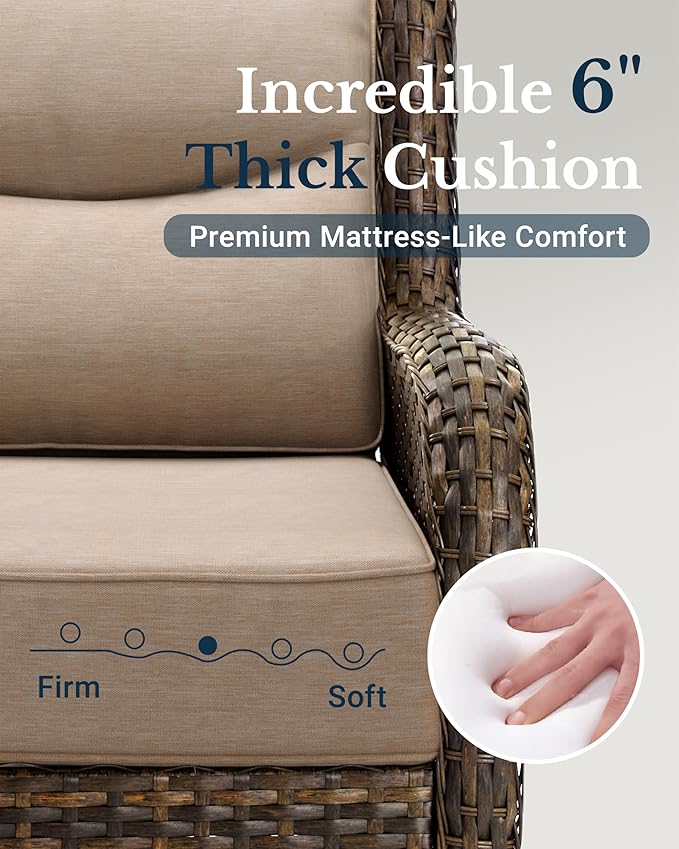 - 6-Inch Extra Thick Seat Cushion: Each cushion of our patio swivel chair and sofa is made of 6-Inch thick, 28D high-density foam—up to 40% more cushioning depth, 30% better bounce-back and 2x the durability than 4-Inch of most outdoor sets. Sit back, feel the lasting difference