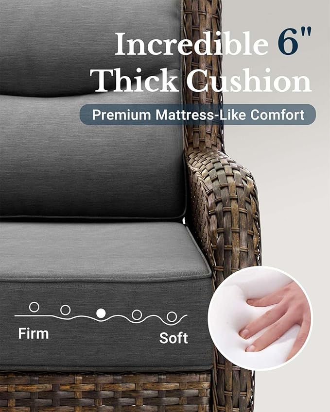- 6-Inch Extra Thick Seat Cushion: Each cushion of our patio swivel chair and sofa is made of 6-Inch thick, 28D high-density foam—up to 40% more cushioning depth, 30% better bounce-back and 2x the durability than 4-Inch of most outdoor sets. Sit back, feel the lasting difference