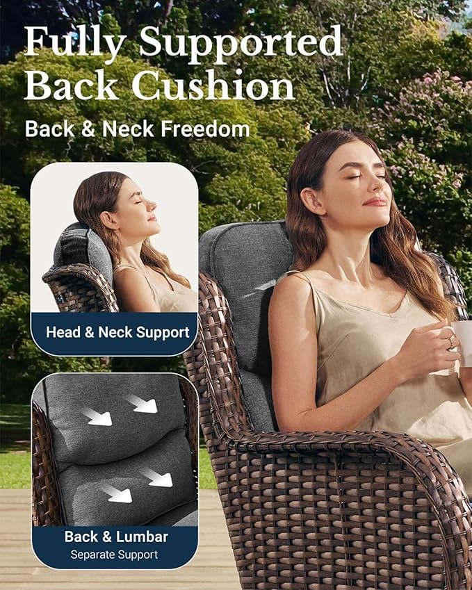 - All-Weather Materials: A heavy-duty metal frame—robot-welded for 350+ lbs support and stability, with rust/chip/corrosion-resistant e-coating—ensures years of outdoor use. Handwoven PE rattan resists cracking, fading, warping in sun, rain, snow. Cushion covers is made of 100% solution-dyed olefin yarns for fade-proof color (1,000+ hours direct sun), water-resistant, quick-drying. For longevity, store or cover cushions in heavy rain/extreme weather