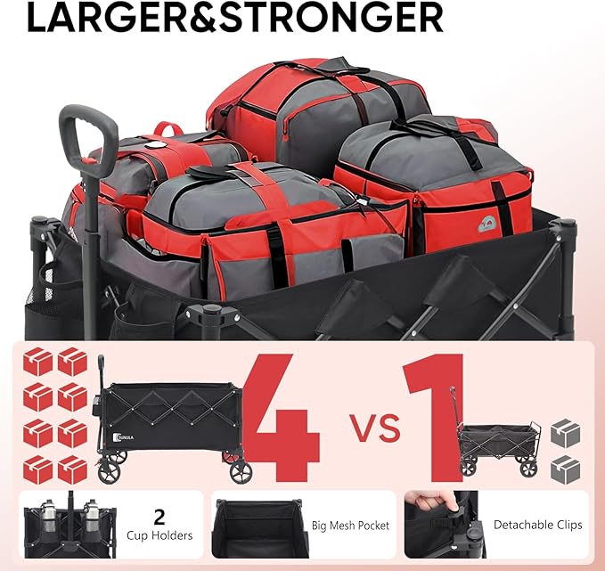 Collapsible Foldable Wagon Cart with 330lbs Weight Capacity, Heavy Duty Folding Wagon Cart with Big All-Terrain Wheels & Drink Holders. Black