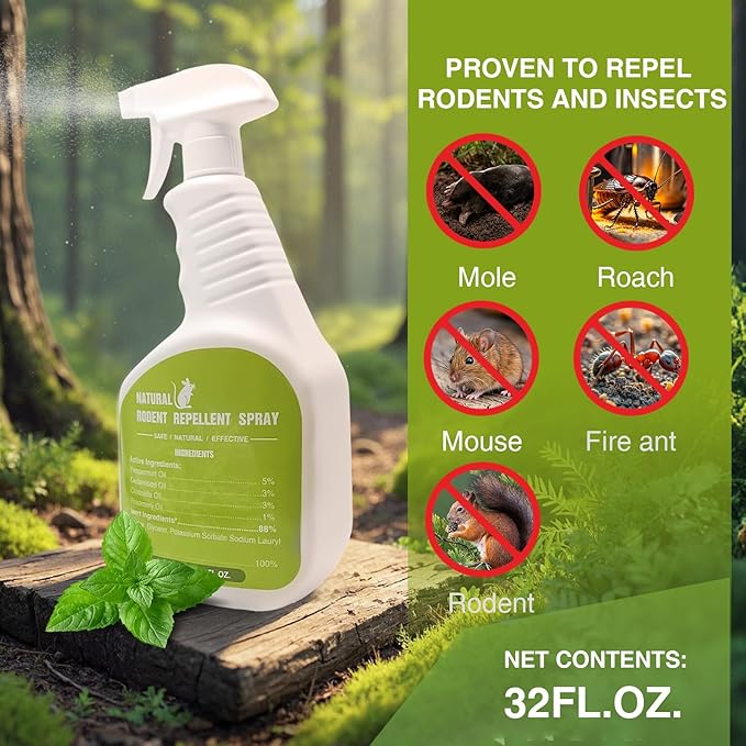 Peppermint Oil Spray for Rodents - Pure Peppermint & Mint Oil Spray for Mouse, Mice, Rat - R odent/Mouse Repellent for Indoor, Outdoor, Car Engine, Home, Attic, Garage - Pet & Kids Safe.(32 Oz)