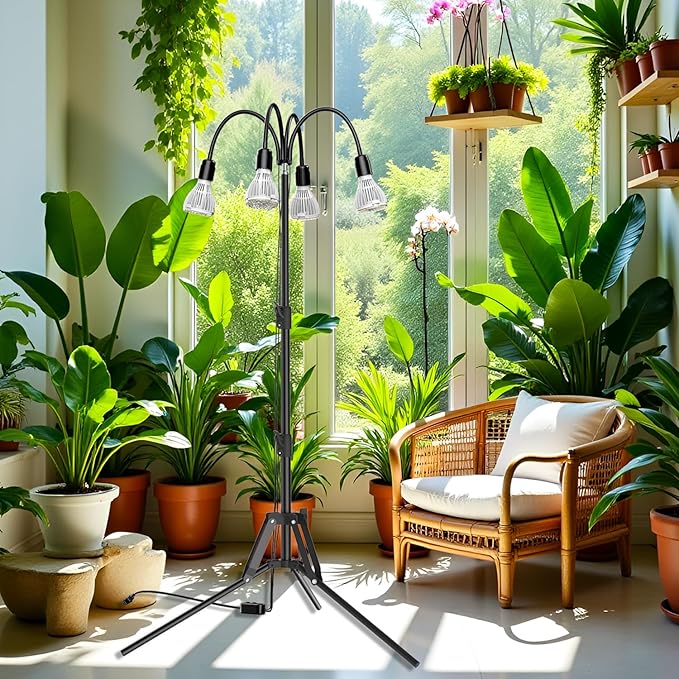 - Adjustable Height & Easy Installation: The SANSI plant grow lights feature an adjustable height range of 35 to 64 inches, making them versatile enough to suit most indoor plants, from small potted varieties to tall plants. The 360-degree flexible gooseneck and 4-head design ensure optimal light distribution across a wide area. Installation is quick and easy, requiring no tools