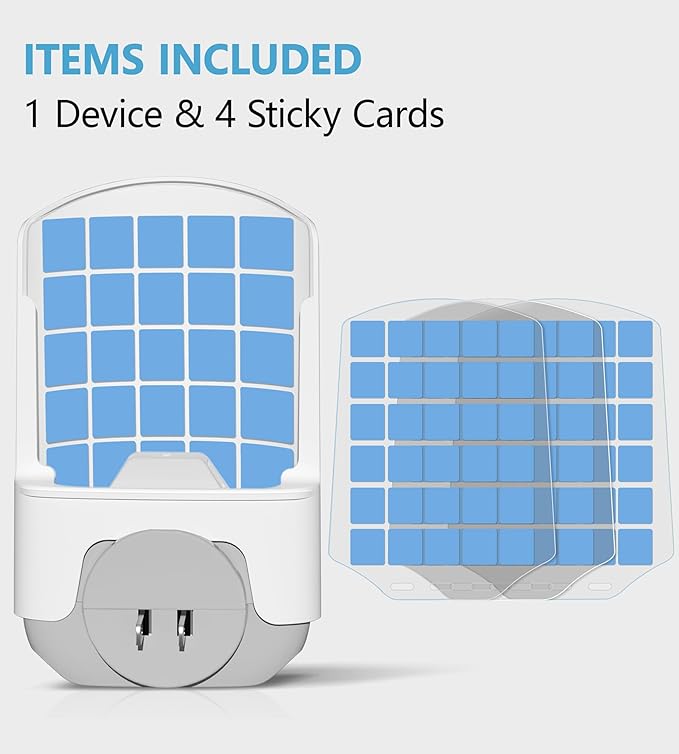 - Upgraded Materials: Crafted from durable, fire-retardant ABS material, this flying insect trap ensures long-lasting safe use. The plug-in housing is lightproof, directing light onto the device and surrounding walls to better attract insects. The sticky card features blue grid patterns to enhance attraction and maximize effectiveness, making it a perfect indoor fruit fly trap for pest control