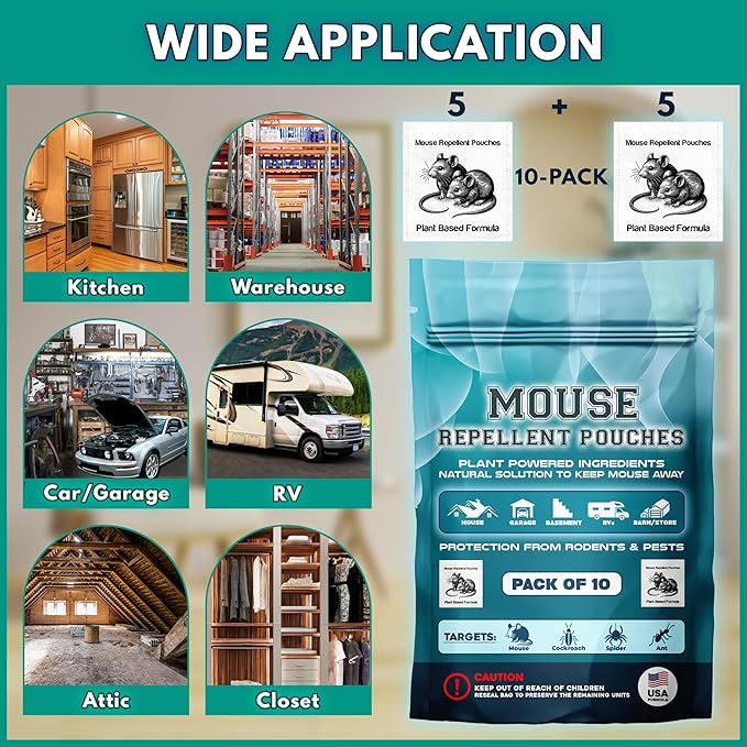 - EASY TO USE: Package includes 10 individually sealed Mouse repellent sachets which are very easy to use. Simply remove the rodent-repellent pouches from the packaging resealable bag & place in the affected areas prone to rodent’s activity, simply forget for 30-40 days NO-MESS / TRAPS / DEAD CLEANING required.