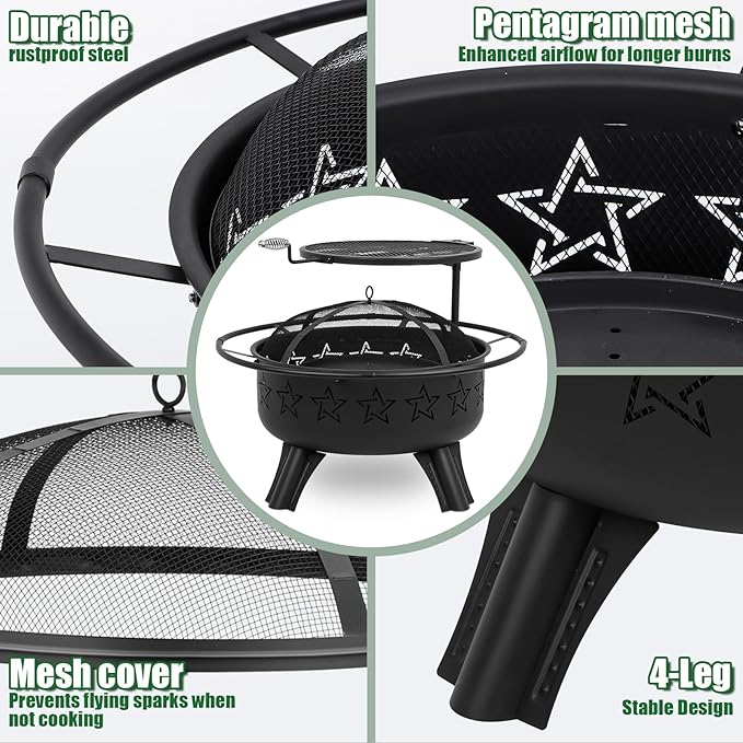 - 2-in-1 Versatile Fire Pit & Grill: ✔ Swivel BBQ grate for even cooking + wood/charcoal compatible (pan & log rack included) ✔ Heavy-duty steel construction (31" wide) for durability & stability