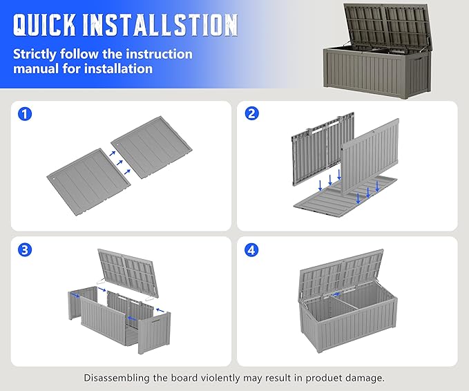 - 👍【Durable and Weather-Resistant】This waterproof outdoor storage box is made of high-quality weather-resistant resin, designed to withstand rain, snow, and sun. Its sturdy construction prevents rust, peeling, and dents, making it an ideal solution for any outdoor area. The stable design ensures it stays secure without wobbling after assembly.