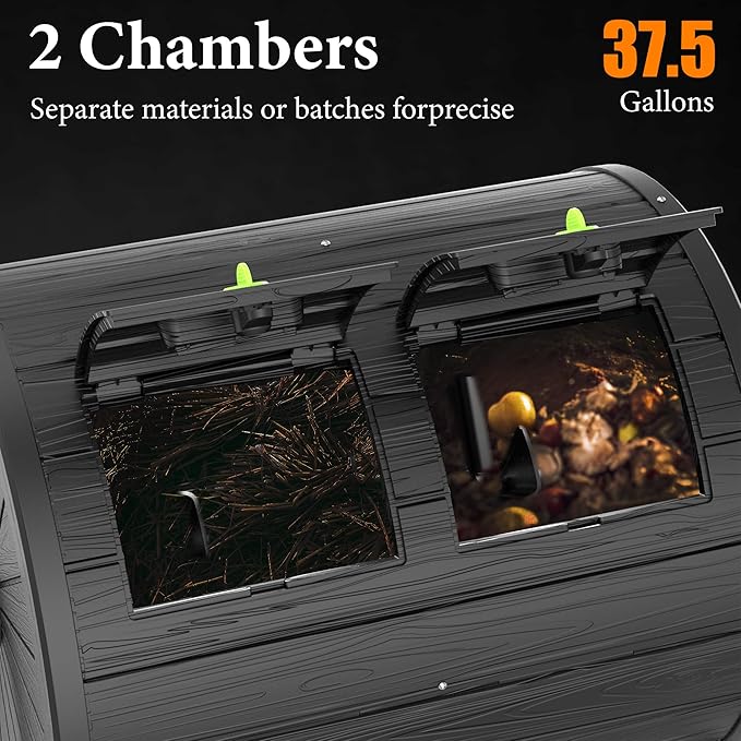 - Large Dual Chamber Design - Features a 37.5-gallon capacity with two independent chambers, allowing one side to complete composting while the other collects fresh scraps and yard waste. This alternating system ensures a continuous supply of nutrient-rich compost for your garden.