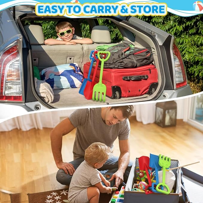 - Fun Beach Set: Perfect for both summer and winter fun! This set includes a green rake, blue scoop, and red shovel, all packed in a mesh bag. Ideal for kids aged 3-8, sparking hours of outdoor play