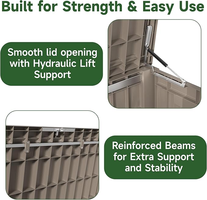 - ENHANCED SAFETY FEATURES - The EasyUp storage box features a hydraulic rod that allows for smooth lid opening and closing, reducing the risk of accidental pinching. The built-in locking mechanism adds an extra layer of security, making it ideal for safeguarding outdoor valuables.