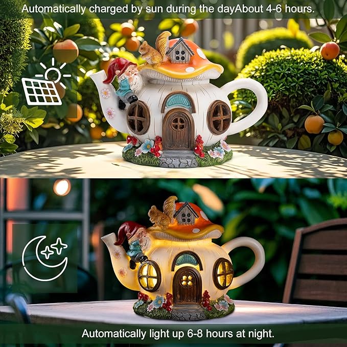 - Unique Mushroom Teapot Design: This solar-powered mushroom teapot light combines a whimsical mushroom house design with a charming garden gnome and a playful squirrel, creating a magical atmosphere in your garden or outdoor space.