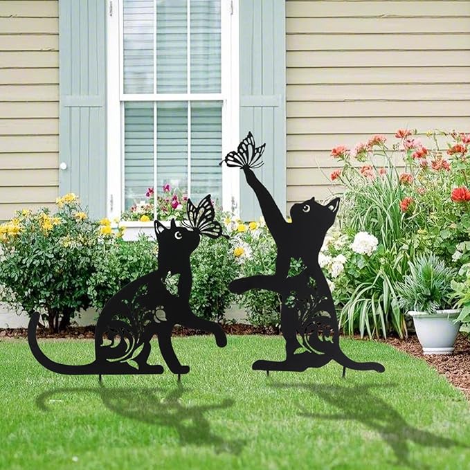 - Garden Stakes Decorative: Add a familiar, animal shape to your outdoor decor with this cat silhouette garden stake. Place it in patio, outside, backyard, front yard, walkways, pathway, lawn, garden
