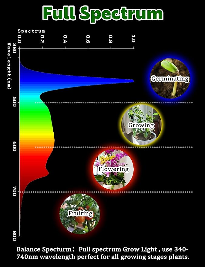 - Innovative technology, plant growth expert: Our Balanced Spectrum LED BR30 plant grow light bulbs uses exclusive full-spectrum LED technology, covering the entire visible spectrum of 400nm-780nm, providing: 400-499nm Blue light for seed germination and seedling growth, 500-570nm green light can promote the expansion and growth of plant leaves, 570-599nm Yellow light promote the growth of plant roots and early germination, 600-699 Red light promote the growth of plant roots and stems, help flowering and fruiting, prolong the flowering period, and increase production