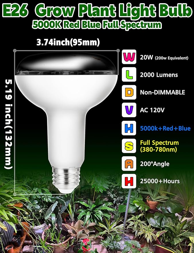 - Full-spectrum lighting: Our E26 BR30 full spectrum grow light bulb simulates sunlight and has been truly tested and certified by a plant growth laboratory. A unique LED chip ratio has been developed based on the effects of different color wavelengths on plant growth. Three different color LED chips are used: red, blue, and 5000k, covering all light bands required for plant growth, providing the full-spectrum lighting required for plant growth, which helps promote plant photosynthesis