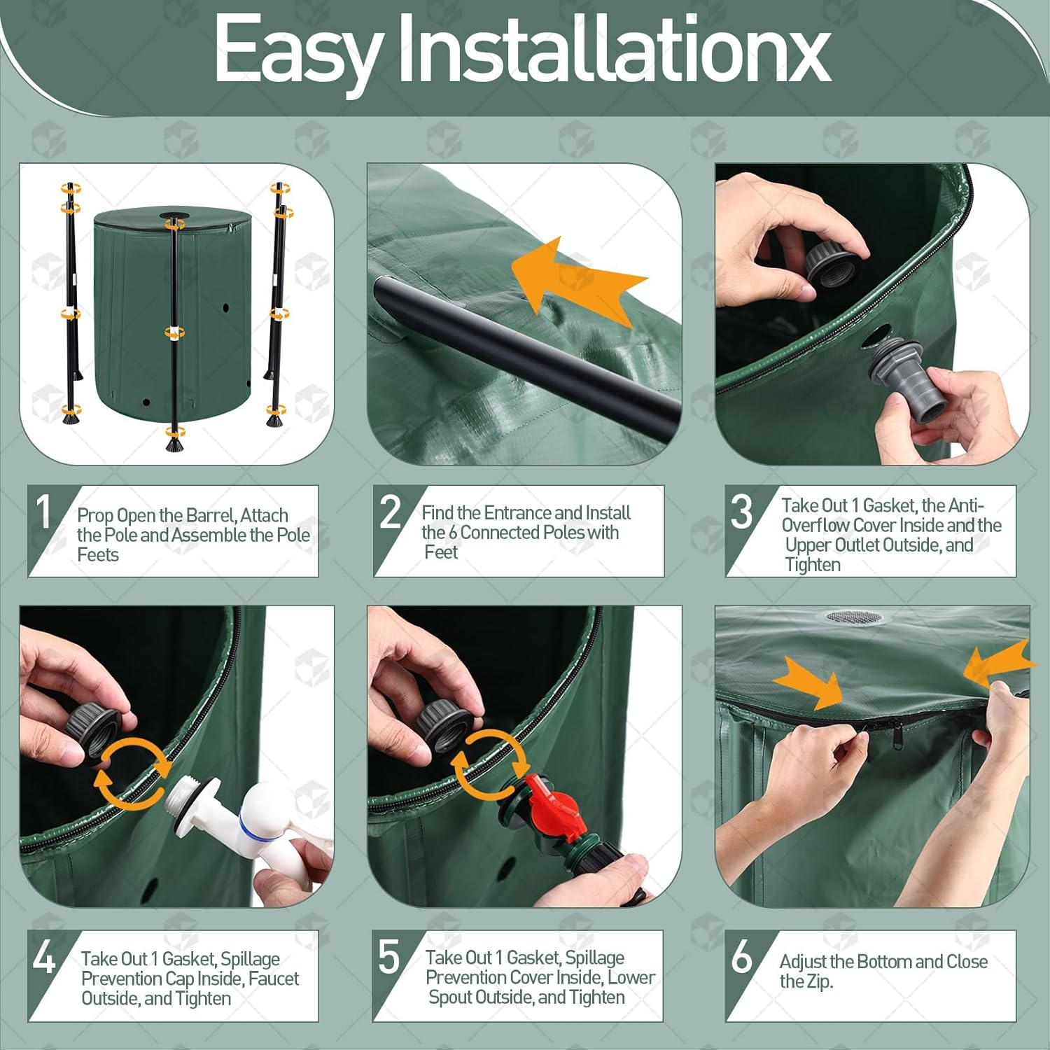 • Easy To Install and Storage: Please Follow the instructions or video for installation. When opening the rainwater collection barrel, you'll need to install the 12 poles and intermediate connection parts, then the 3 spouts (1 Spigot and 2 Overflow) and finally zip up the top. The Foldable design is easy to install, carry and transport; when not in use, it can be placed in the garage or utility room. PLEASE NOTE: Please place it on a flat surface when using it, as this will help to improve the stability better.