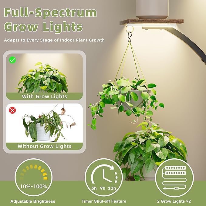 - [K-Shaped Plant Stand with Grow Light]: Enjoy the aesthetic appeal of our creative K-shaped plant stand, enhanced with grow lights to elevate the beauty of your interior spaces. This plant shelf features 2 full-spectrum grow lights with 3/9/12 timers and 10-level dimming, catering to the diverse needs of plants throughout their growth stages. Let natural beauty thrive in your living space without the need for constant outdoor relocation.