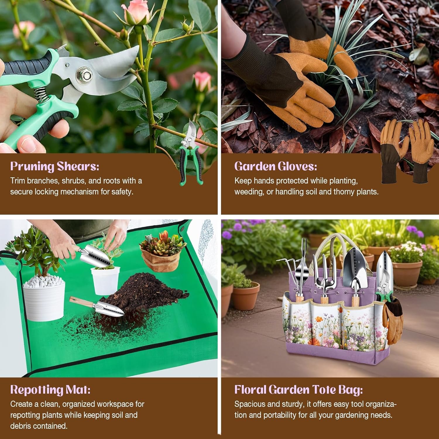 Gardening Tools Set 9-Piece Heavy-Duty Gardening Gifts for Women Mom Wife Gardening Hand Tools with Purple Floral Tote Bag and Repotting Mat, halilus Stainless Steel Garden Supplies Kit