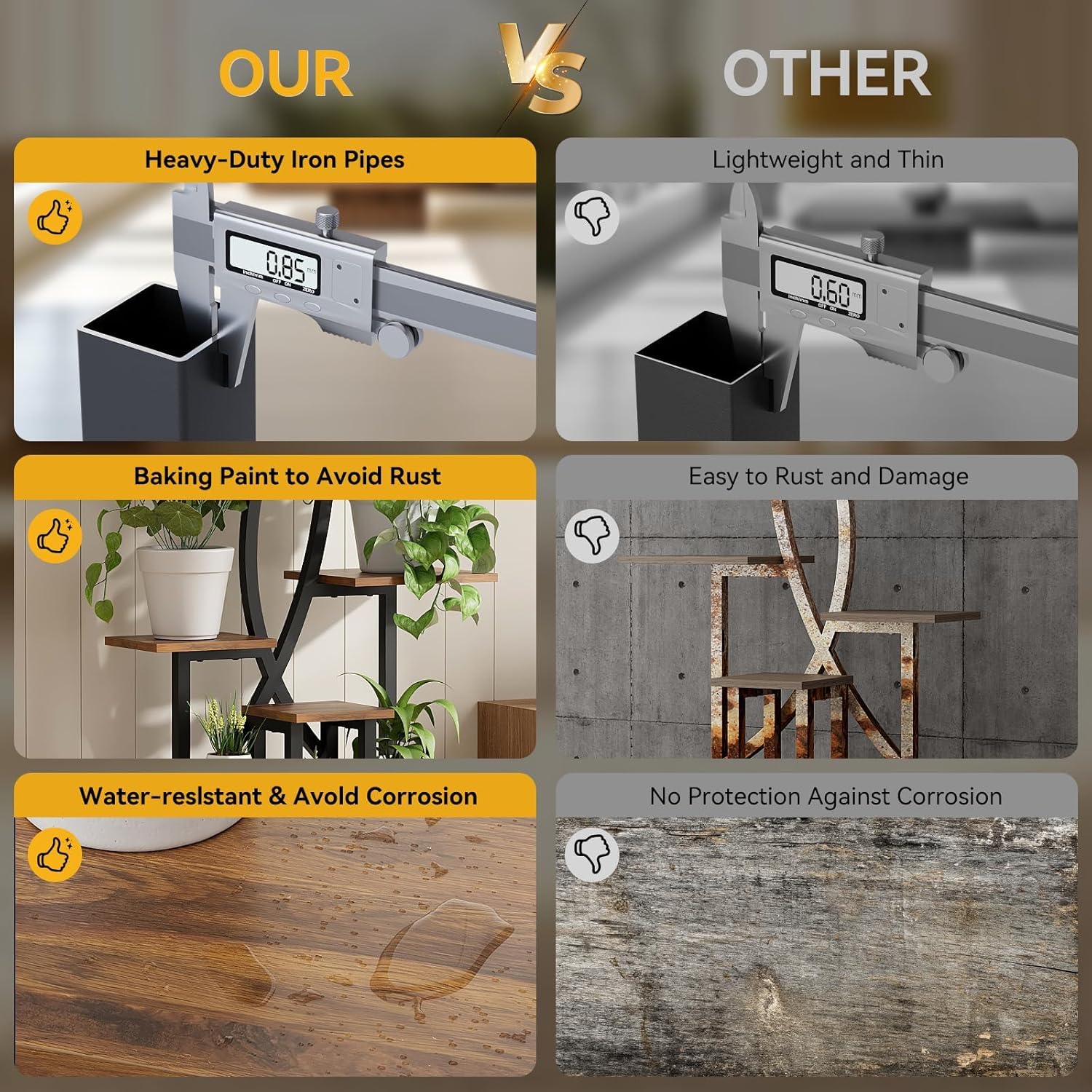 - Durable and Stable Plant Stand β Made with heavy-duty iron pipes and thick particleboard, this plant stand is sturdy and built to last. Its rust-resistant frame and waterproof-coated shelves ensure durability and easy maintenance.