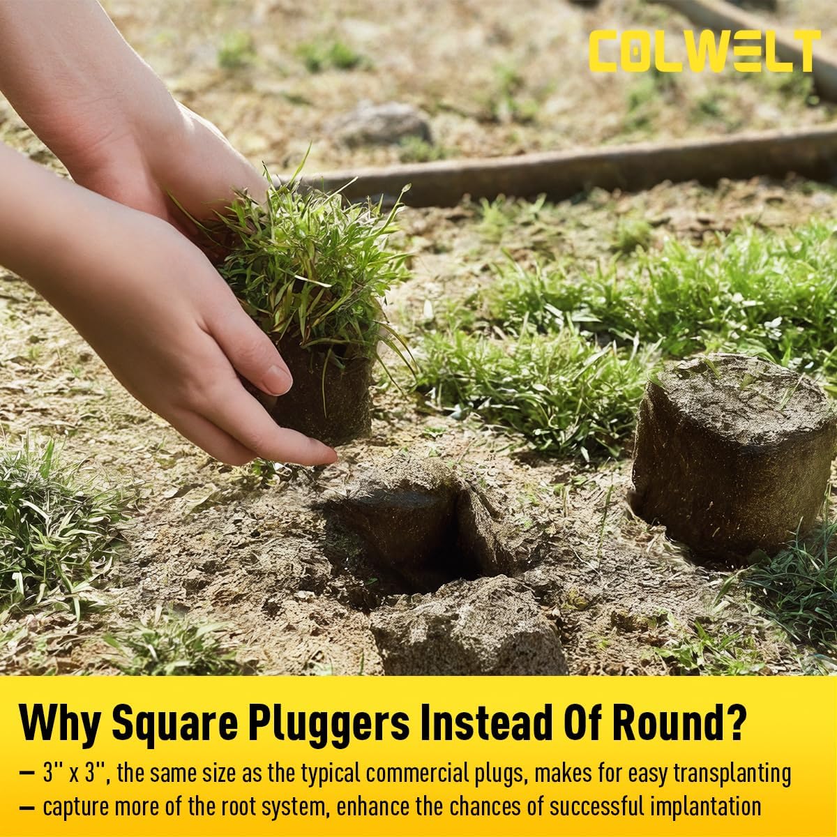 - CUTS A 3" X 3" SQUARE PLUG -- Colwelt grass plugger tool picks up a 3" X 3" square piece of sod or soil, the same size as the typical commercial plugs. Whatโs more, compared to round shapes, square design likely captures more of the root system, enhancing the chances of successful implantation. Assembly is quick and easy with instruction and all necessary fixings and tools. If you have any questions or need assistance, please don't hesitate to contact us. We are always here to help.