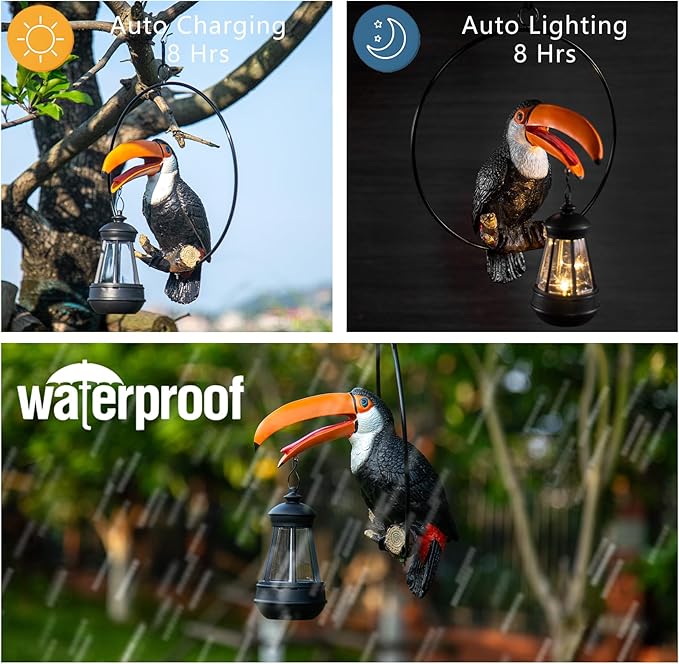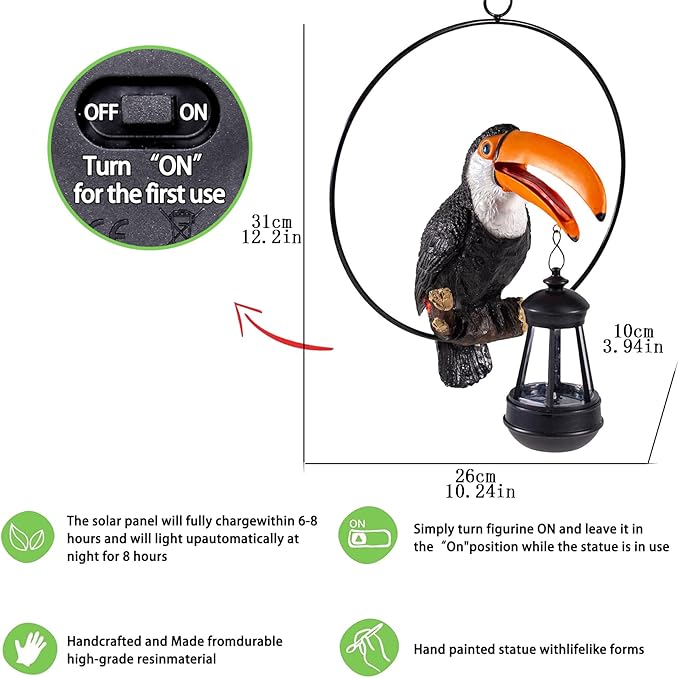 - [Solar Toucan statue]: made of high-quality resin material, whether you hang it outdoors, or indoors, it is a good choice, outdoor special paint, can make it in the outdoors for a long time without fading, not affected by any weather.