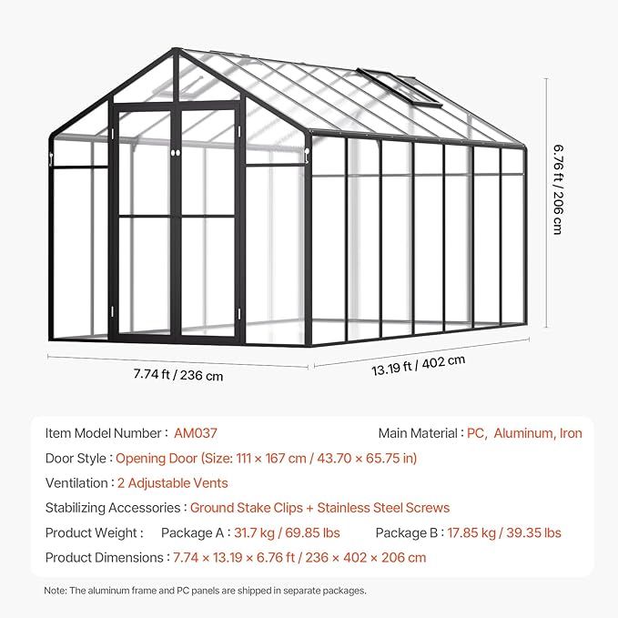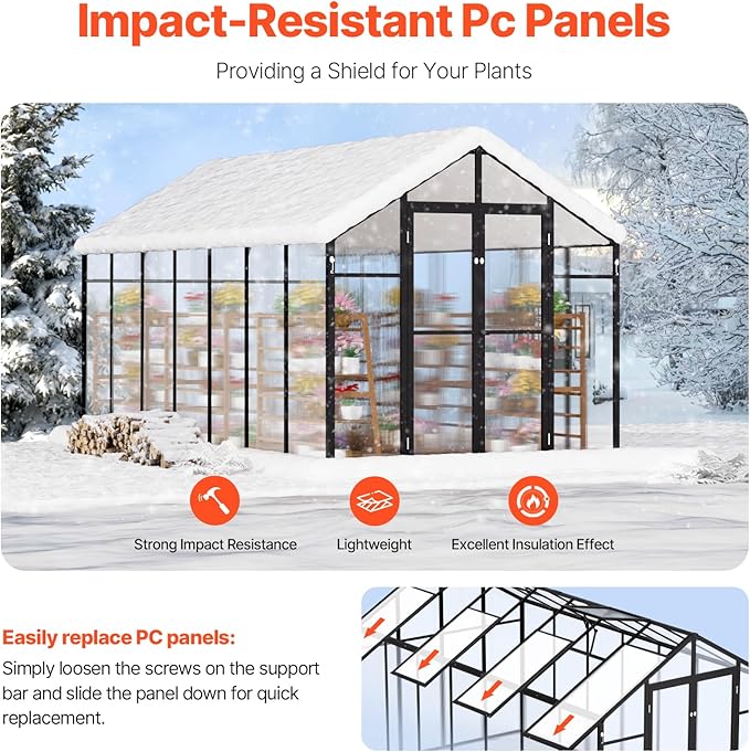 - PC panels Protection: Polycarbonate greenhouse panels with UV protection and impact resistance effectively protect against hail, winds under 5 levels, and other weather conditions, helping plants grow healthily. Our PC panels are easier to replace.Note: In windy or snowy weather, ensure doors and windows are closed to prevent the greenhouse from tipping over due to strong wind.