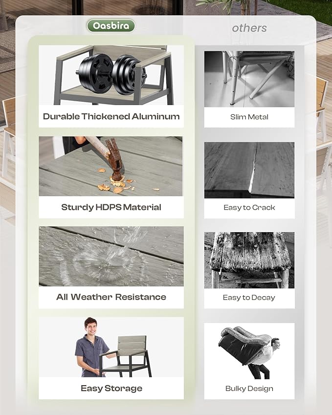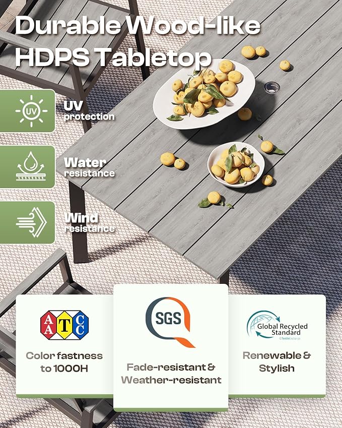 - Premium Material: This outdoor table and chairs set is crafted with high-quality aluminum frame and HDPS material. The aluminum frame features a double-layer design, engineered for exceptional stability and load-bearing capacity. The HDPS tabletop offers a natural wood-like finish, combining elegance with durability and weather resistance
