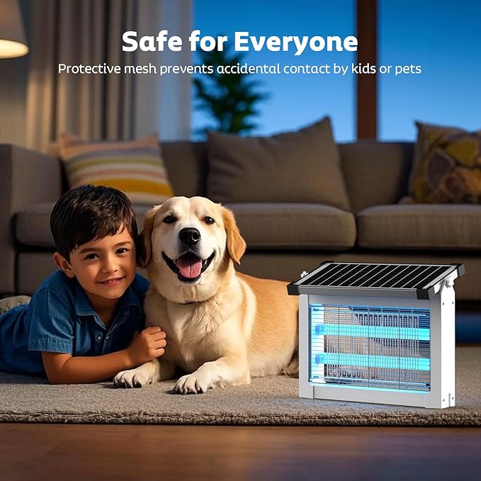 - EPA Registered, Safe for Children & Pets: Designed with safety in mind, our electric bug zapper indoor uses safe, physical mosquito control with no sprays or odors. The sturdy ABS housing features protective mesh around the high-voltage electric grid, preventing accidental contact by kids or pets. With an adjustable solar panel and an extension cord, you can place the fly killer anywhere for effective pest control, offering peace of mind while protecting your family, patio, and home from pests