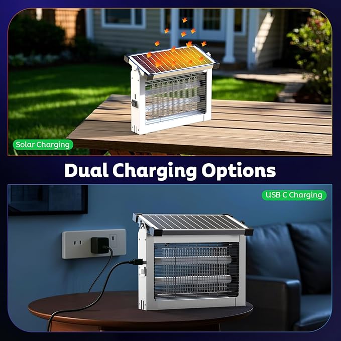 - Dual Charging Options: Solar & USB Powered: This solar powered mosquito zapper features a 10W 5V monocrystalline solar panel and a 4,000mAh rechargeable battery for eco-friendly, energy-efficient operation. Charge it with direct sunlight for sustainable use, or quickly recharge via USB using the included 4ft USB-C cable in just 3-4 hours. Enjoy up to 12 hours of continuous protection on a full charge. Ideal for both indoor and outdoor use, whether at home, in an RV, camping, or in your backyard