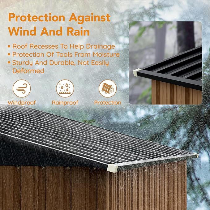 - [Security and Durability] The whole storage shed is a steel frame structure, the metal garden storage shed adopts electro-galvanized steel process and paint treatment, which is suitable for various climates, without worrying about the metal rusting, the all-metal storage shed will not be deformed by the sun, and has excellent moisture-proof ,UV resistant performance.