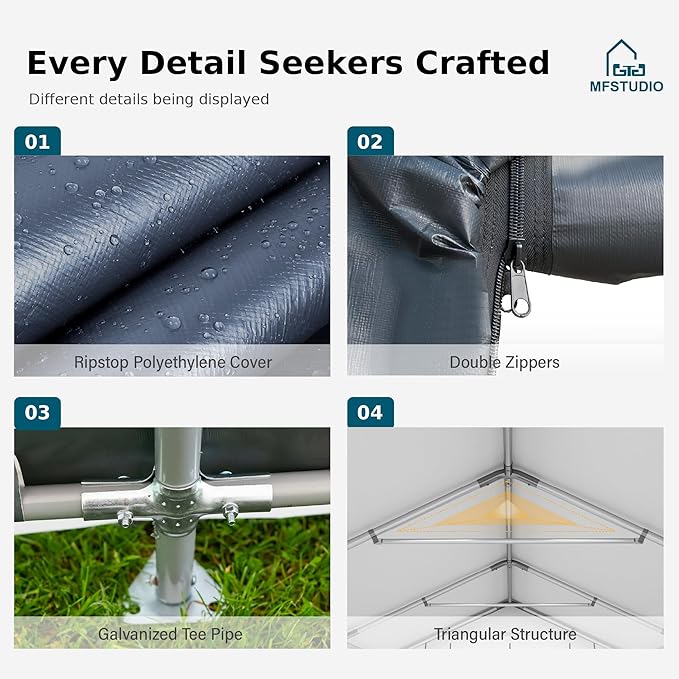 - Stable Construction: Tent Shed Built with sturdy galvanized steel pipes, The joint adopts a spray molding process that prevents chipping, peeling, rust, and corrosion.the heavy duty garage shelter with 4 roof fasteners and 4 S hook make sure the storage cover fits the frame tightly, windproof and more stable