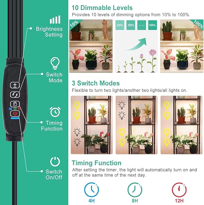 - 10 Dimming Levels & 3 Lighting Modes: These grow lights offer 10 adjustable brightness levels ranging from 10% to 100%, helping you save energy while meeting your plants' lighting needs. They also feature 3 lighting modesātwo lights on, the other two lightson, or four lights onāgiving you full control over light coverage. Provide your plants with the ideal light intensity for optimal growth and care!