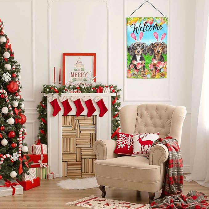 Dachshund Dog Bunny Cute Flower Happy Easter Garden Flag Welcome Party Outdoor Outside Decorations Picks Home House Garden Yard Decor 12x18 Inch