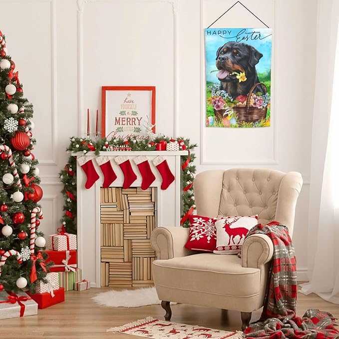 Happy Easter Rottweiler Dog Black Flower Eggs Garden Flag Welcome Party Outdoor Outside Decorations Picks Home House Garden Yard Decor 12x18 Inch