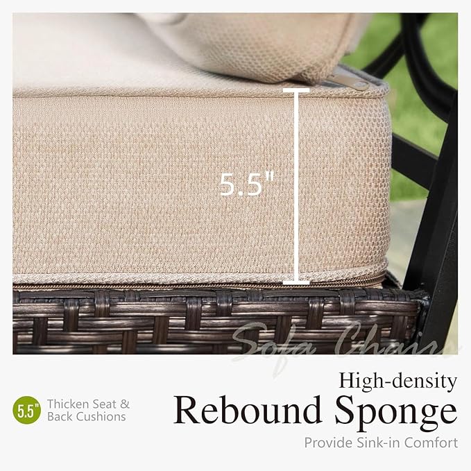 - Ultimate Comfort with Thick Cushions: Featuring 5.5-inch thick cushions, this conversation patio furniture Set ensures maximum comfort and support. The extra-wide, deep seats and high backrest offer a relaxed, cozy experience, perfect for lounging or engaging in long conversations. Enjoy outdoor comfort like never before with this stylish and comfortable set.