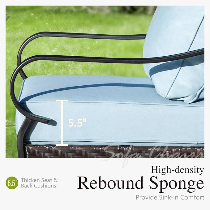 - Ultimate Comfort with Thick Cushions: Featuring 5.5-inch thick cushions, this conversation patio furniture Set ensures maximum comfort and support. The extra-wide, deep seats and high backrest offer a relaxed, cozy experience, perfect for lounging or engaging in long conversations. Enjoy outdoor comfort like never before with this stylish and comfortable set.