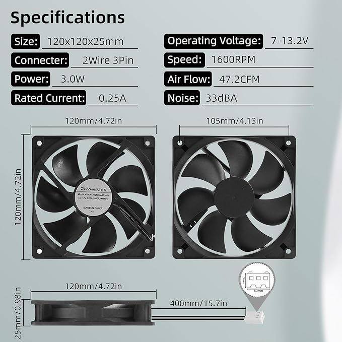 - 【High-Performance Cooling】 The 120×120×25mm fan delivers 47.2CFM airflow at 1600RPM (±10%) with just 33dBA noise, ensuring powerful yet silent operation for ventilating seedlings, hydroponics, and small greenhouses.