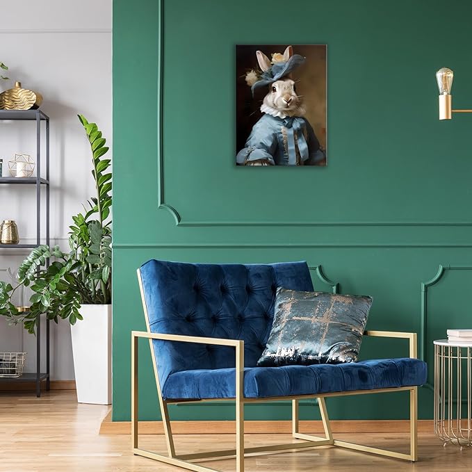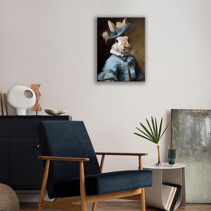 - VINTAGE DESIGN: Whimsical portrait of a white rabbit dressed in elegant Victorian-style attire featuring a light blue dress with ruffles and matching bow hat