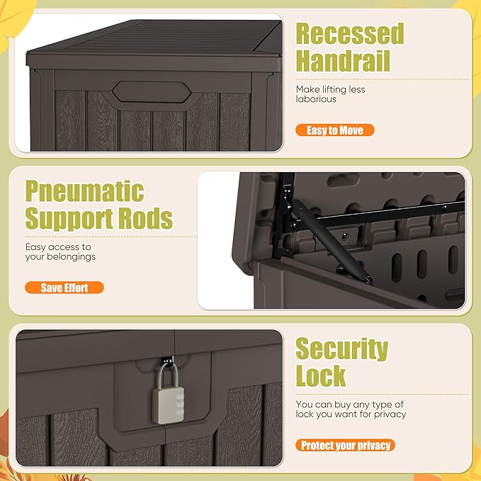 - Function Design: Equipped with two pneumatic support rods, it can be easily opened and slowly closed to safely access your items and provide you with protection. Lockable lid ensures your items are more secure.