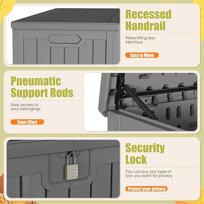 - Function Design: Equipped with two pneumatic support rods, it can be easily opened and slowly closed to safely access your items and provide you with protection. Lockable lid ensures your items are more secure.