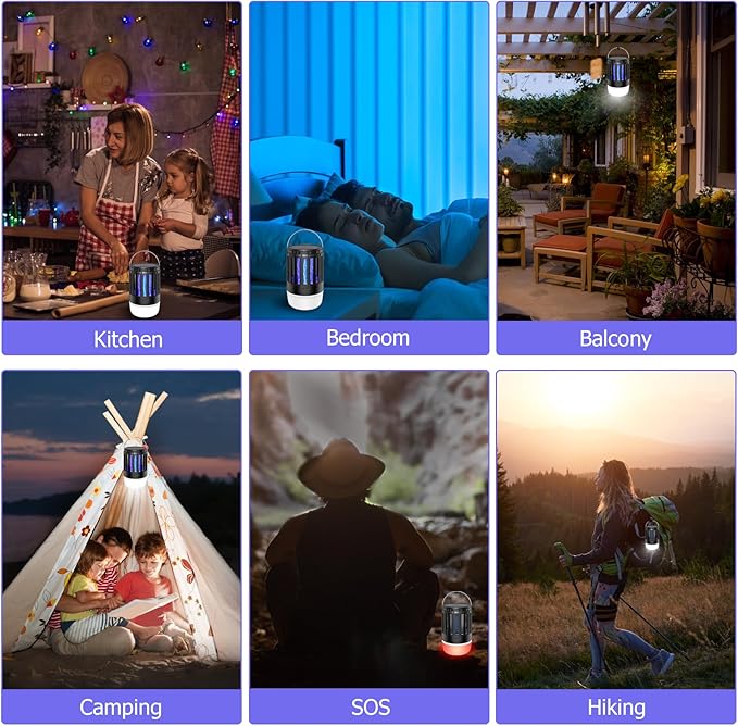 - USB and Solar Charging: There are two ways to charge solar bug zappers: USB charging and solar power supply, supporting multiple charging modes (suitable adapter, power bank, car or computer). After USB charging, the camping light bug zapper outdoor can provide you with 4-7 hours of strong light or 12 hours of mosquito protection.